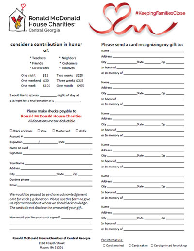 Each $15 donation directly defrays the expense of one night's lodging at the Ronald McDonald House of Central Georgia when you indicate your gift is for our Share-A-Night program. Although the actual cost of housing one family for one night is $165, we ask families for a small donation of $15 per night. Most families cannot afford even this small donation, but no one is turned away for inability to pay.